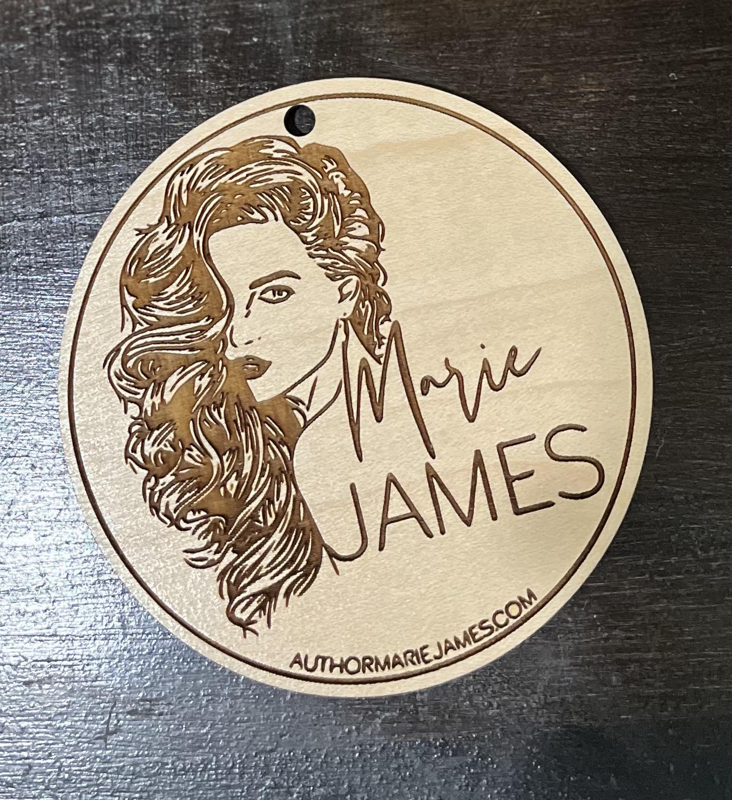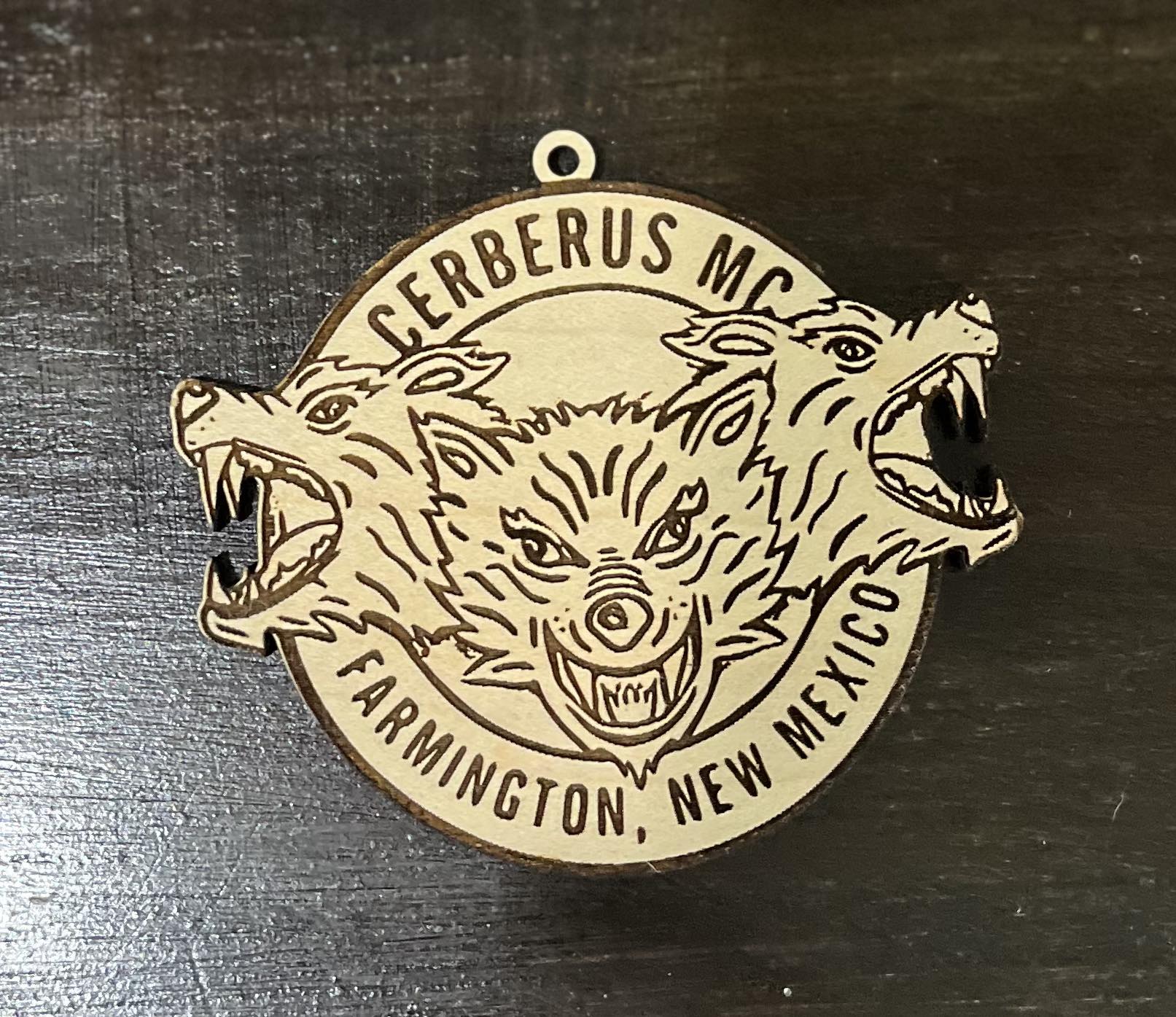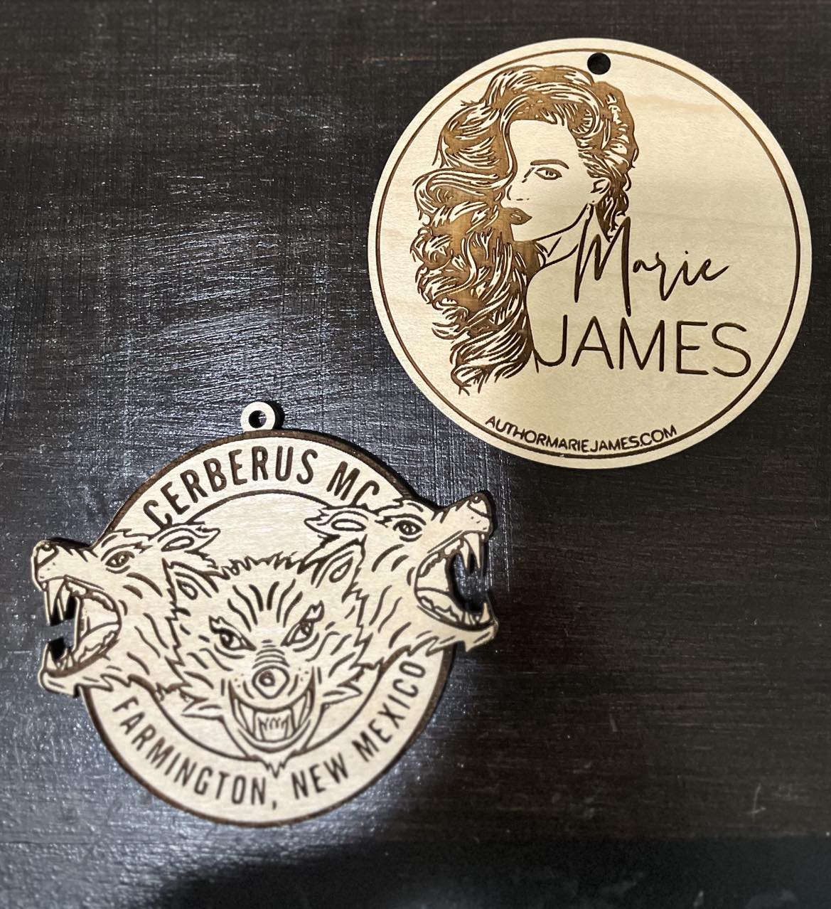 4" wooden ornament featuring Marie James Logo or Cerberus MC Logo